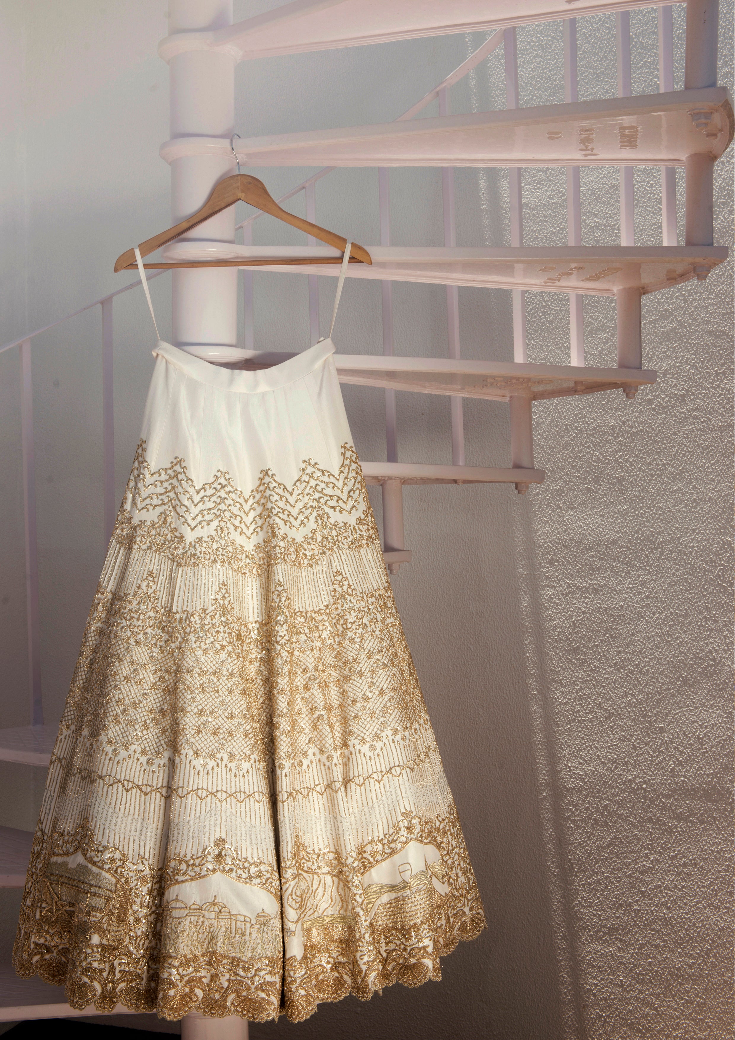 The one thing I did decide was to design and create all of my outfits. And I wanted the piece I got married in to be truly one-of-a-kind. I wanted it to represent who I am, and tell our love story. And so I began work on my own Love Story Lehenga, one kali (or panel) at a time. Our names were hand sewn in beautiful zari, which was hidden into the embroidery of the fabric, forming a delicate optical illusion.