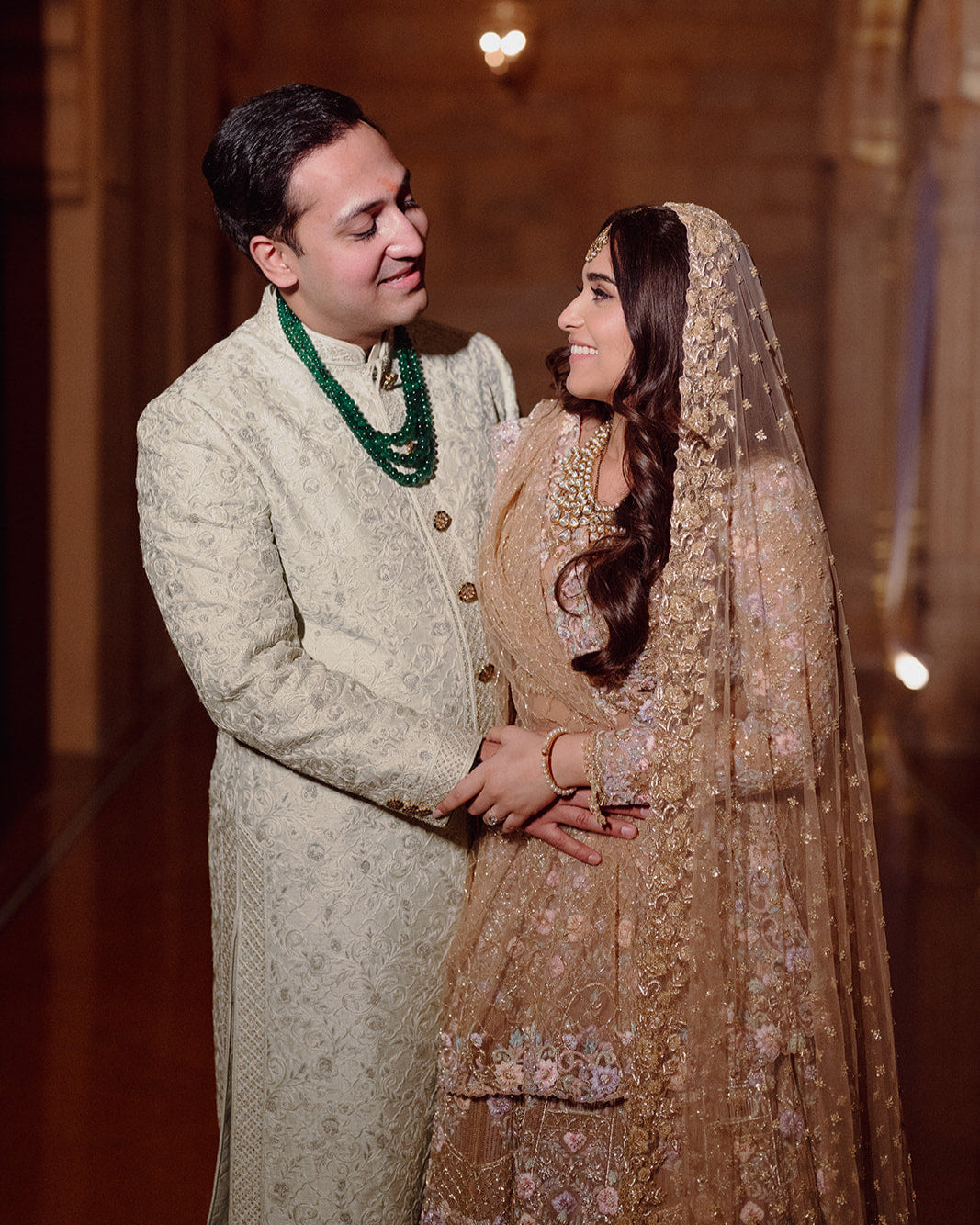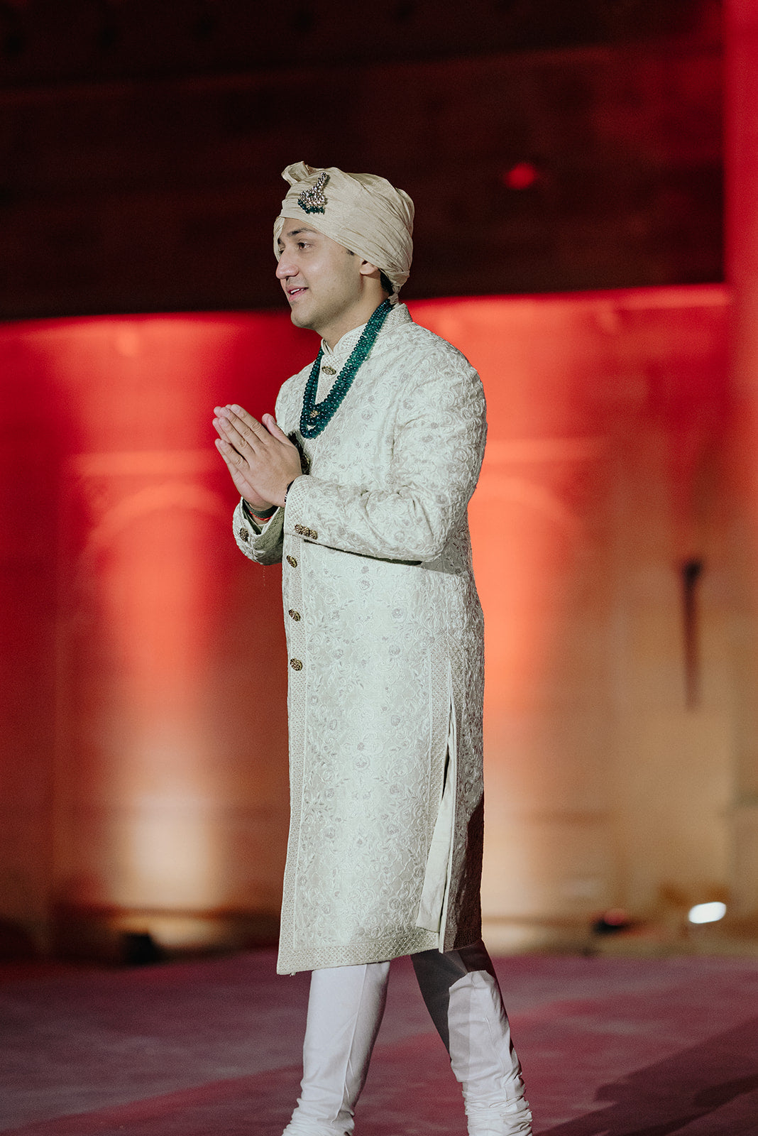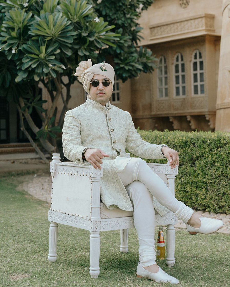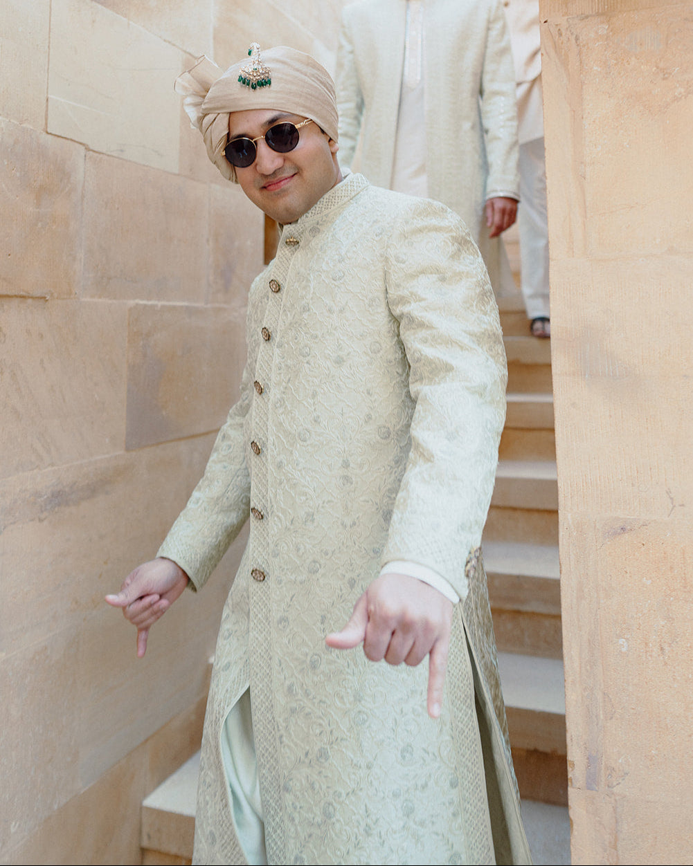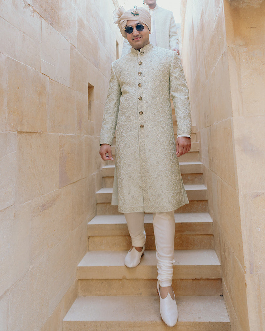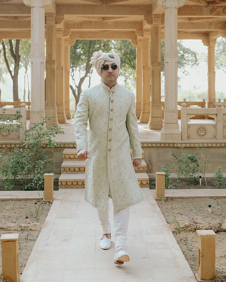 Handcrafted in pure raw silk, this pistachio green sherwani features meticulous zardosi embroidery with silk thread detailing and gold zari highlights. A finely beaded gold border enhances it. Styled with a pure silk kurta and classic ivory churidar.