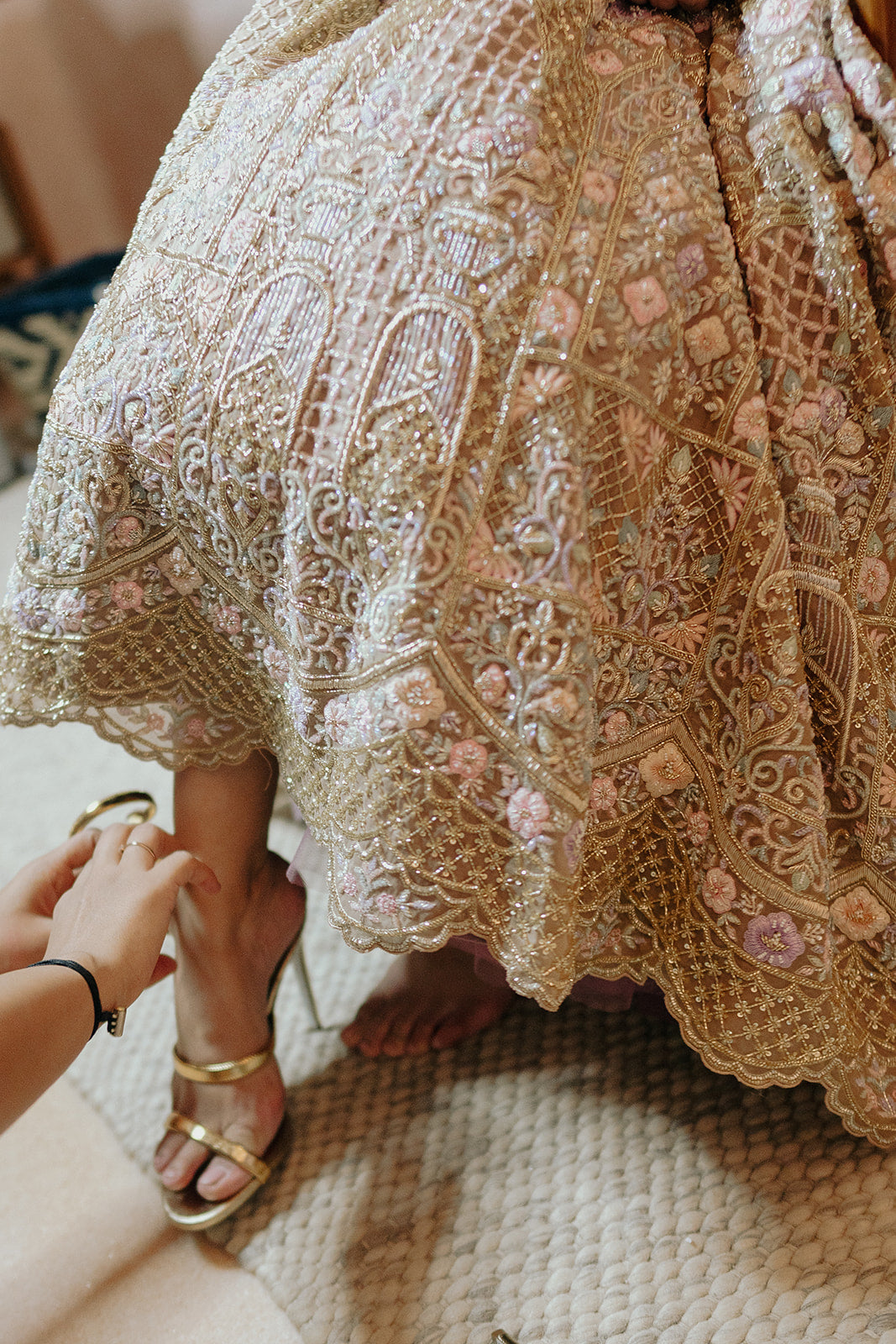 A hand-embroidered gold lehenga featuring intricate zardosi work with floral and geometric motifs, highlighted by multicolored flowers. It is styled with two dupattas—one with cascading tassels and floral motifs, and another with jaal embroidery and a multicolored floral border.