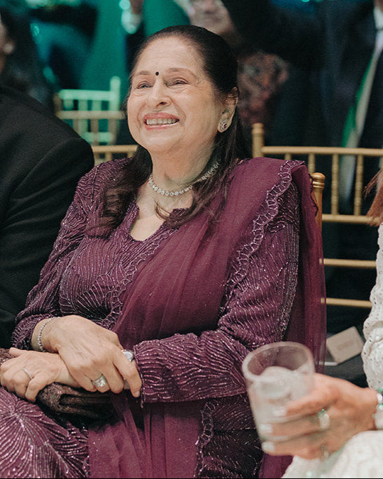 A silk georgette kurta in aubergine, embellished with self-colored glass beading embroidery and edged with handmade crystal tassels. Styled with a tulle dupatta with a matching border.