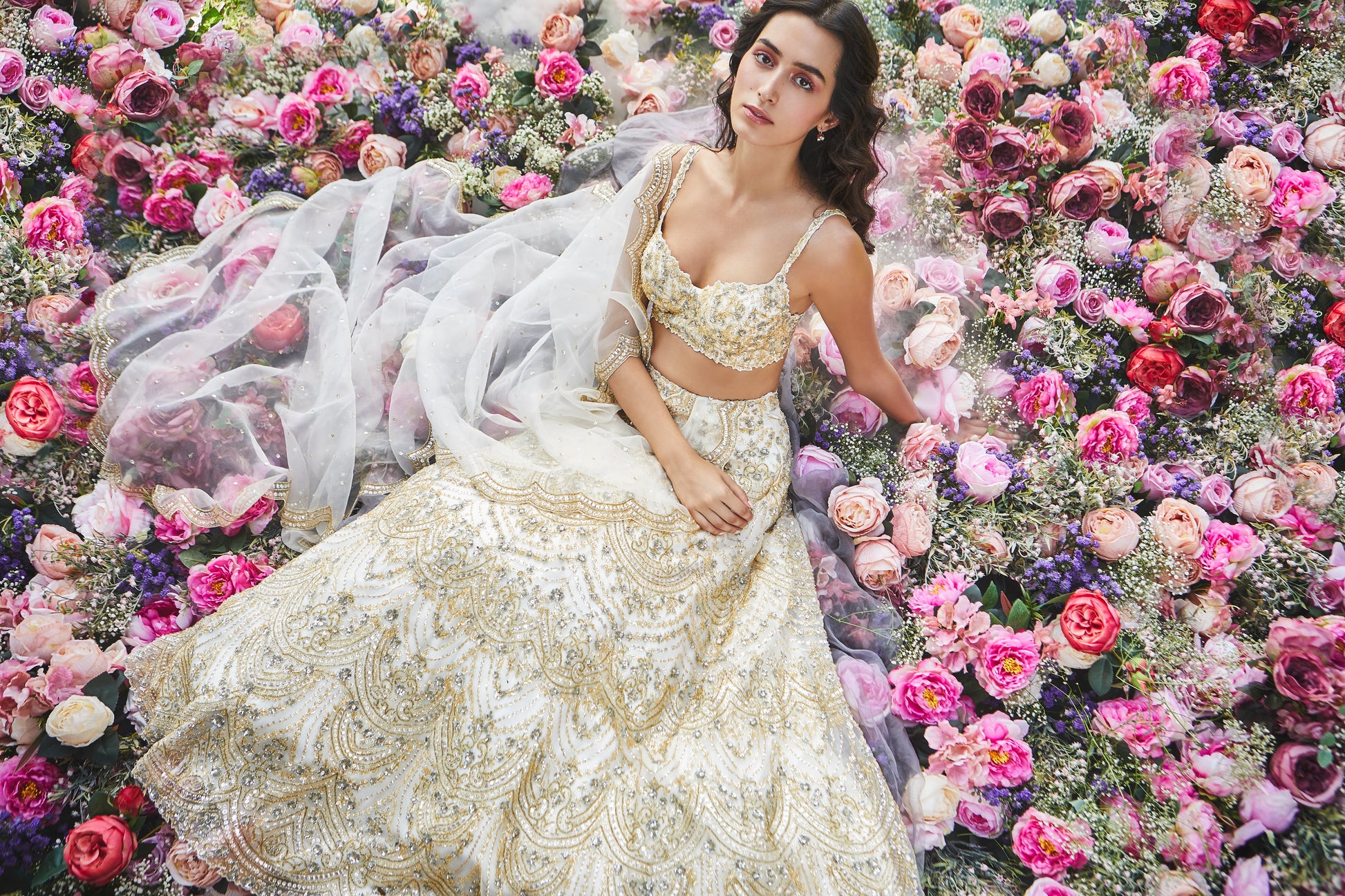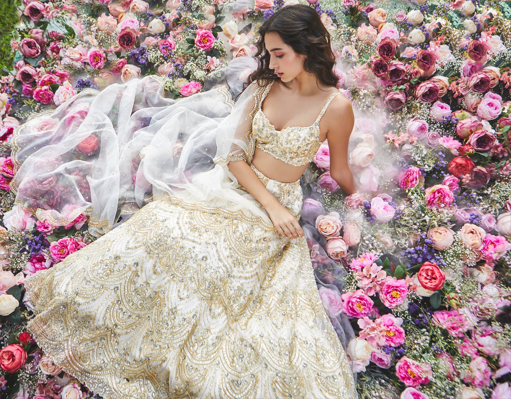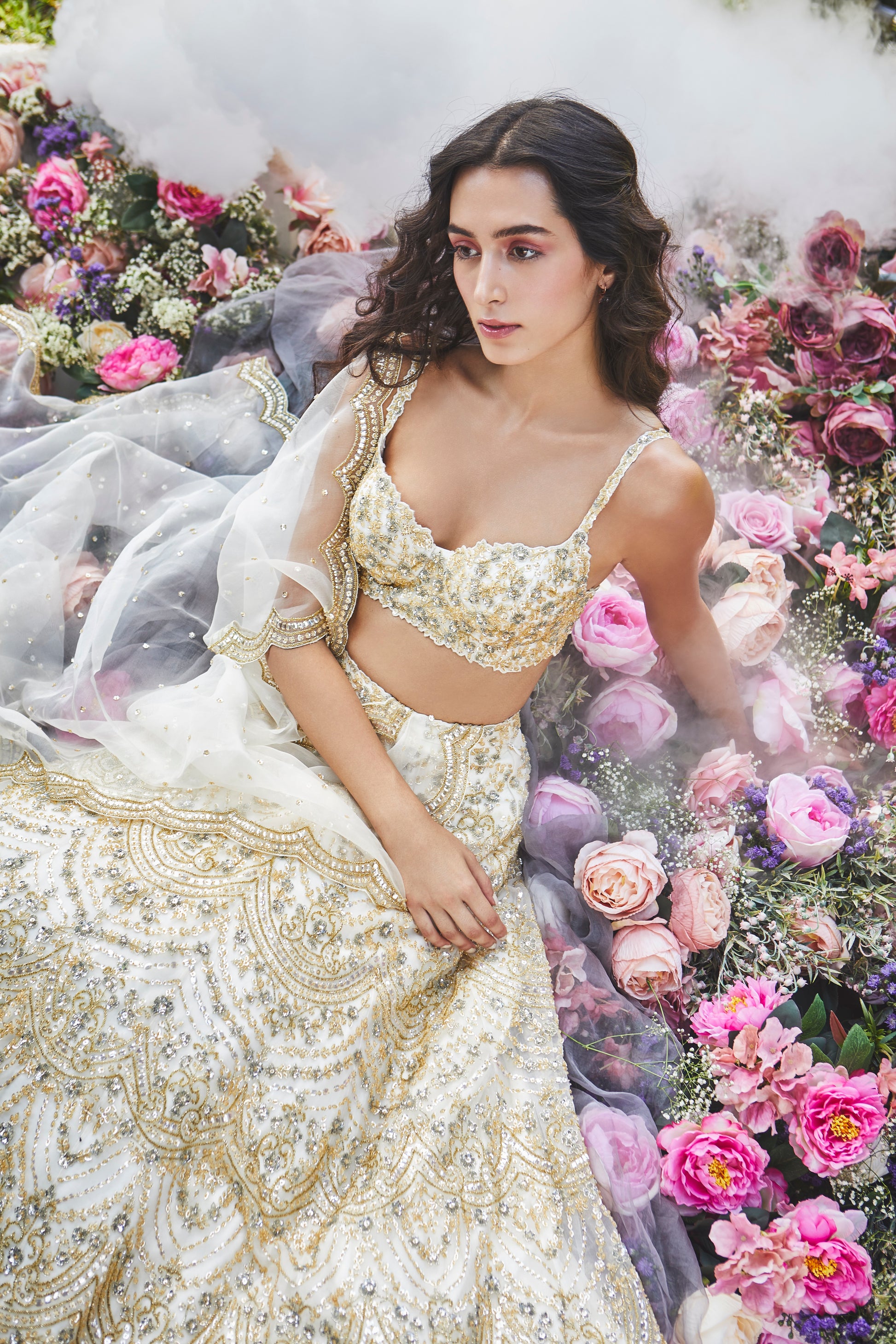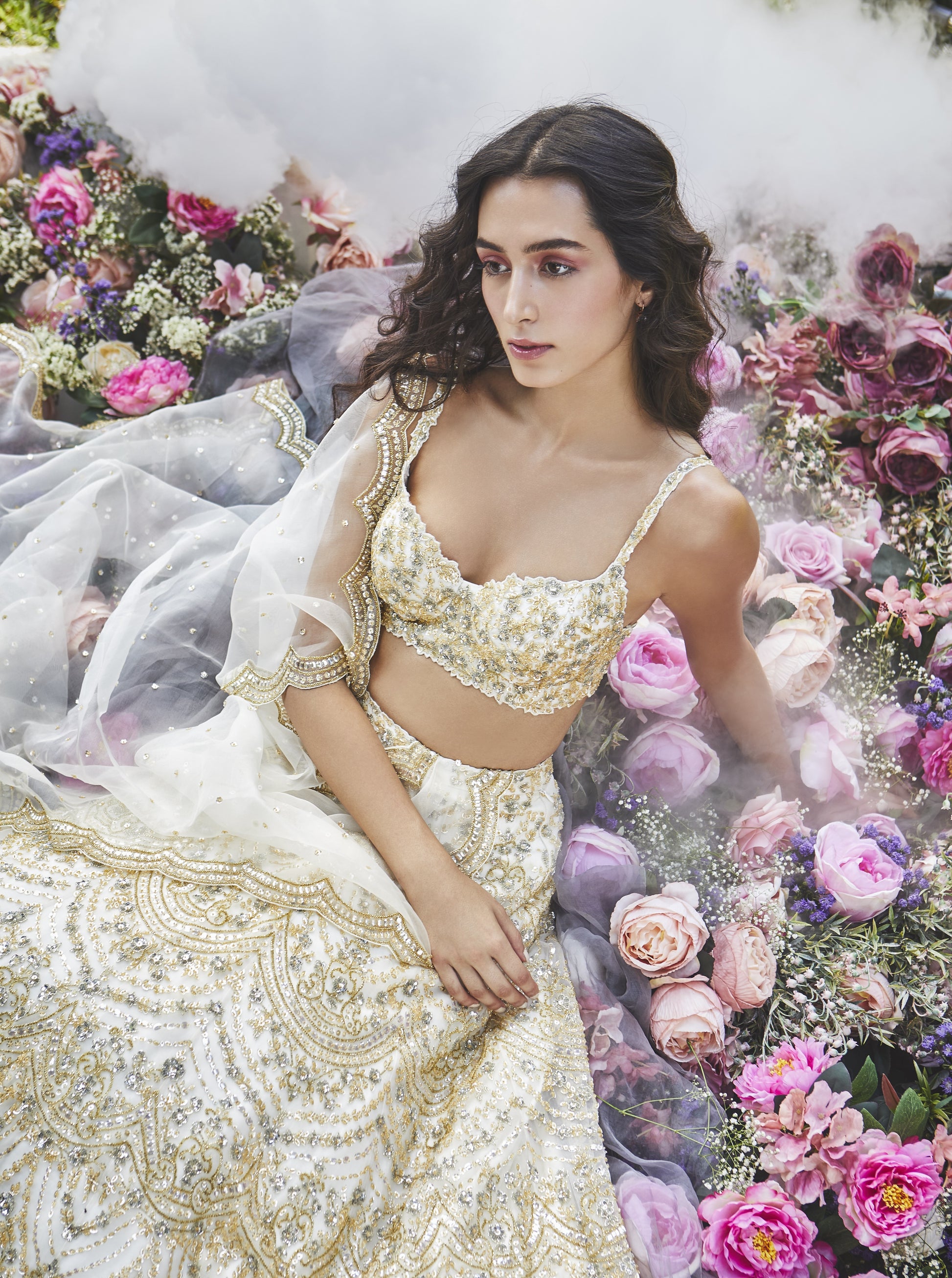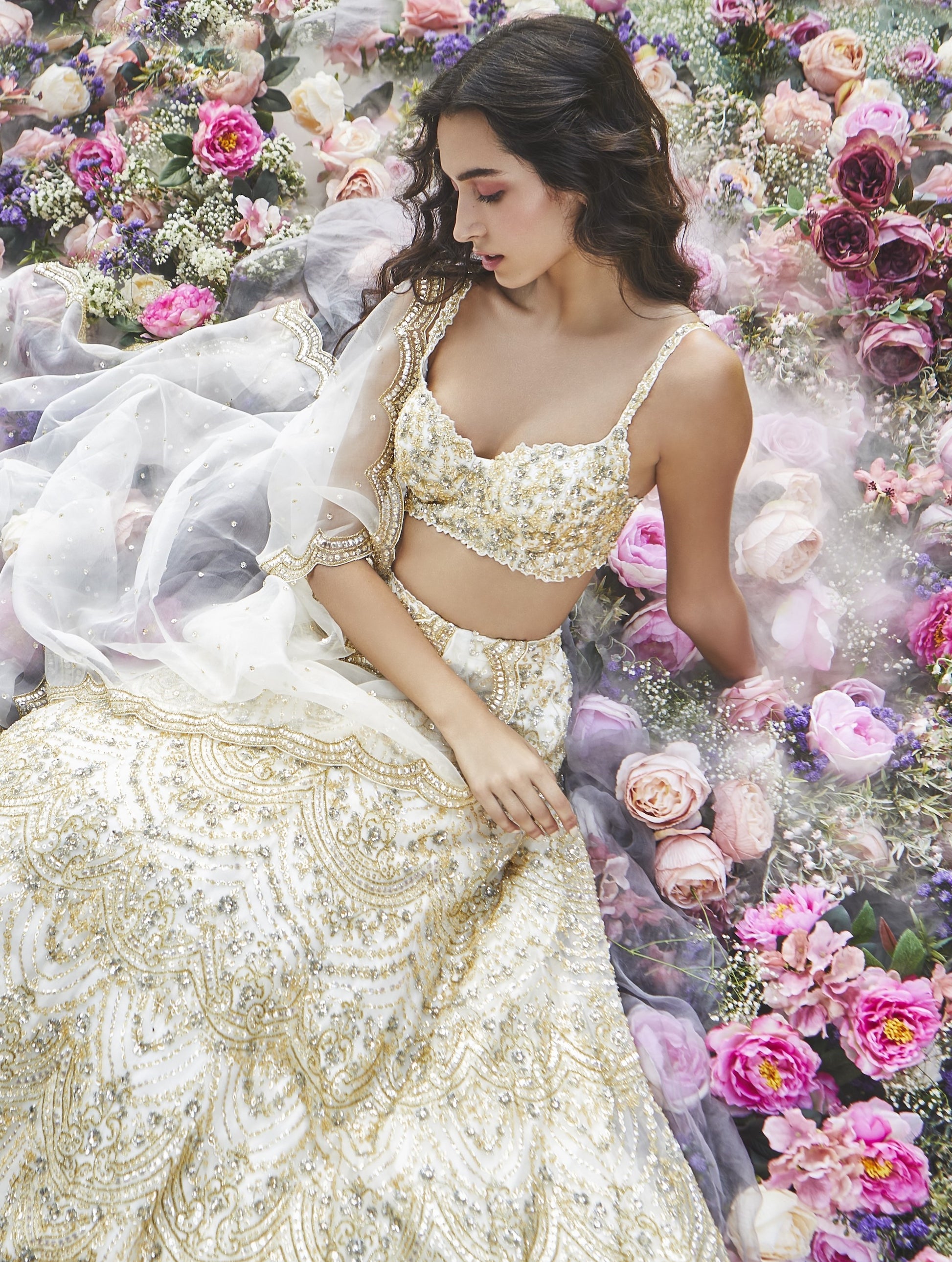 An ivory organza lehenga with delicate handwork in a combination of gold, silver and champagne crystals, sequins and glass beading. Paired with one of our signature bustier blouses and a bridal tulle scallóped dupatta.
